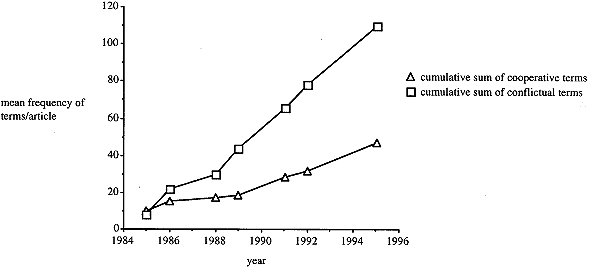 Figure 8.8: Average frequency of terms per article in Shijie jingji yu zhengzhi, 19851995 |