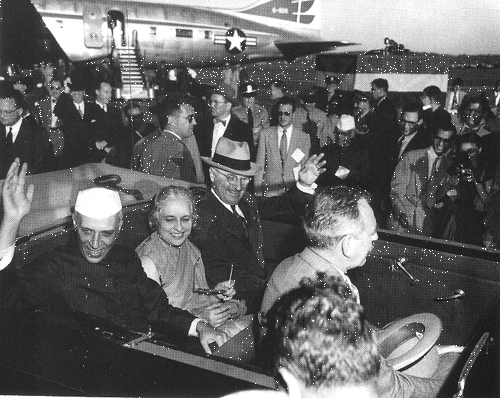 Photo 1, President Harry S. Truman and Indian Prime Minister Jawaharlal Nehru drive to the White House following the Indian leader's arrival at Washington's National Airport, October 11, 1949. Nehru's sister, Ambassador Yijaya Lakshmi Pandit, sits between the two leaders. Secretary of State Dean Acheson is in the automobile's front seat. (Photo by the U.S. Department of State, courtesy of the Harry S. Truman Library.)