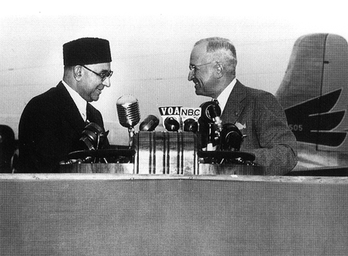 Photo 2, Truman welcomes Pakistani Prime Minister Liaquat Ali Khan to the United States at Washington's National Airport, May 1950. (Photo by the U.S. Department of State, courtesy of the Harry S. Truman Library.)
