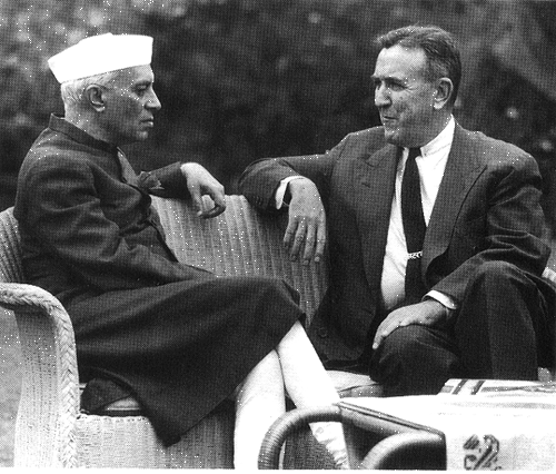 Photo 4, U.S. Ambassador Chester Bowles chats Prime Minister Nehru during one of their frequent meetings. (Photo by W. Suschitzky, courtesy of Yale University Library.)