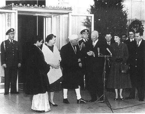 Photo 5, President and Mrs. Dwight D. Eisenhower greet Indian Prime Minister Nehru and his daughter, Indira Gandhi, before meeting with reporters at the White House, December 1956. (Photo by the National Park Service, courtesy of the Dwight D. Eisenhower Library.)