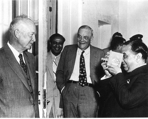 Photo 8, Pakistani Prime Minister Huseyn Shaheed Suhrawardy snaps a photogenic souvenir of his White House visit with President Eisenhower, July 1957. Pakistani Ambassador Mohammed Ali Bogra and Secretary of State John Foster Dulles watch with amusement. (Photo by the National Park Service, courtesy of the Dwight D. Eisenhower Library.)
