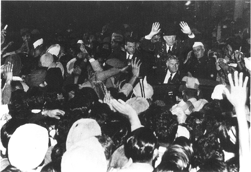 Photo 9, Eisenhower stands to return the enthusiastic greetings of Indian well-wishers during an open-air automobile ride following his arrival in New Delhi, December 1959. (Photo by the U.S. Information Agency, courtesy of the Dwight D. Eisenhower Library.)