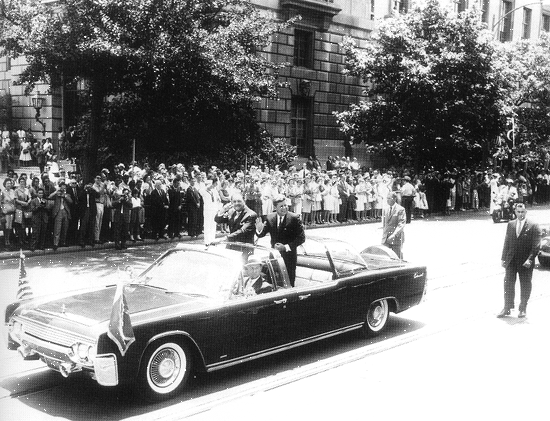 Photo 10, President John F. Kennedy and Pakistani President Mohammed Ayub Khan stand to greet onlookers during a drive along Washington's Pennsylvania Avenue, July 11, 1961. Ayub had just arrived in Washington for several days of official talks with the new American president. (Photo courtesy of the John F. Kennedy Library.)