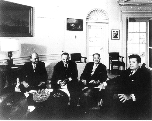Photo 11, Kennedy meets with Ayub Khan at the White House, July 11, 1961. Secretary of State Dean Rusk and Vice-President Lyndon B. Johnson join Ayub on the Oval Office couch.(Photo courtesy of the John F. Kennedy Library.)