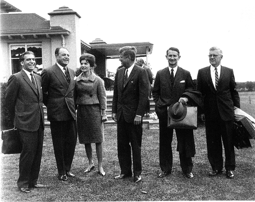Photo 15, President and Mrs. Kennedy join Ayub and Pakistani Ambassador Aziz Ahmed (at left) on the law of a Newport, Rhode Island, estate, September 254, 1962. Assistant Secretary of State Philips Talbot (with hat) and Ambassador Walter P. McConaughy stand at the right. (Photo courtesy of the John F. Kennedy Library.)