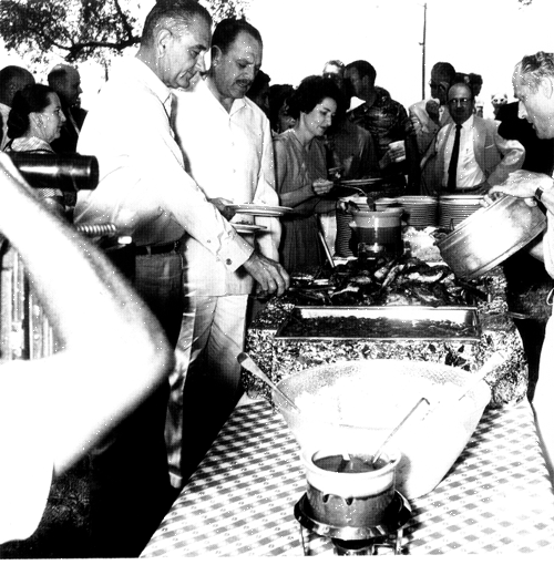 Photo 19, Vice-President Johnson introduces Ayub to a Texas-style barbecue at his Johnson City ranch, July 1961. (Photo by Art Kowert, courtesy of the Lyndon B. Johnson Library.)