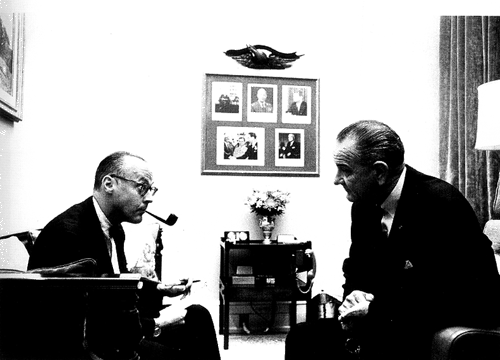 Photo 20, President Johnson consults with one of his, and President Kennedy's, most influential South Asia policy advisers, National Security Council aide Robert Komer, June 30, 1966. (Photo by Yoichi R. Okamoto, courtesy of the Lyndon B. Johnson Library.)