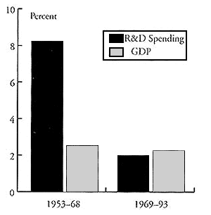 Figure 1. The Great Slowdown in R&D Expenditures (Annual average percent increase in real dollar expenditures). Source: National Science Foundation, National Patterns of R&D Resources, 1992. |