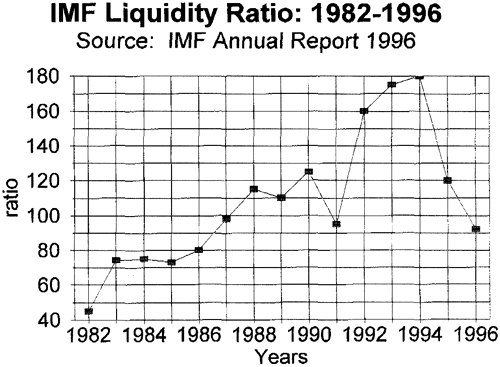 Despite these instruments, however, the IMF frequently expresses concerns over its resource constraints. Recently the Fund has calculated an index of its liquidity, i.e. the level of usable cash balances relative to short-term liabilities. Figure 2 illustrates how this liquidity ratio has fluctuated from 19821996. Furthermore, there is empirical evidence to suggest that the ease of acquiring IMF credit varies over time (Bird 1994), and is more difficult to obtain during periods of crisis (Rowlands 1994). Such variance suggests that despite its flexibility, the IMFs ability to carry out its mandate of financing balance of payments difficulties is being compromised by inadequate resources.