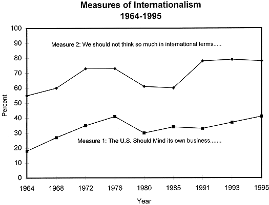 Measure 2 involves public reactions to the statement “We should not think so much in international terms but concentrate more on our own national problems and building up our strength and prosperity here at home.” Although the two trend-lines trace a roughly comparable trajectory, the level of apparent isolationism is much greater in the second case than in the first. Measure 1 implies that about 2 in 5 Americans have opted for isolationism after the Cold War; Measure 2 implies that the figure is nearly twice as high!
